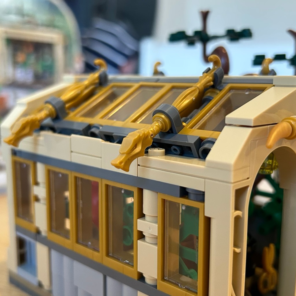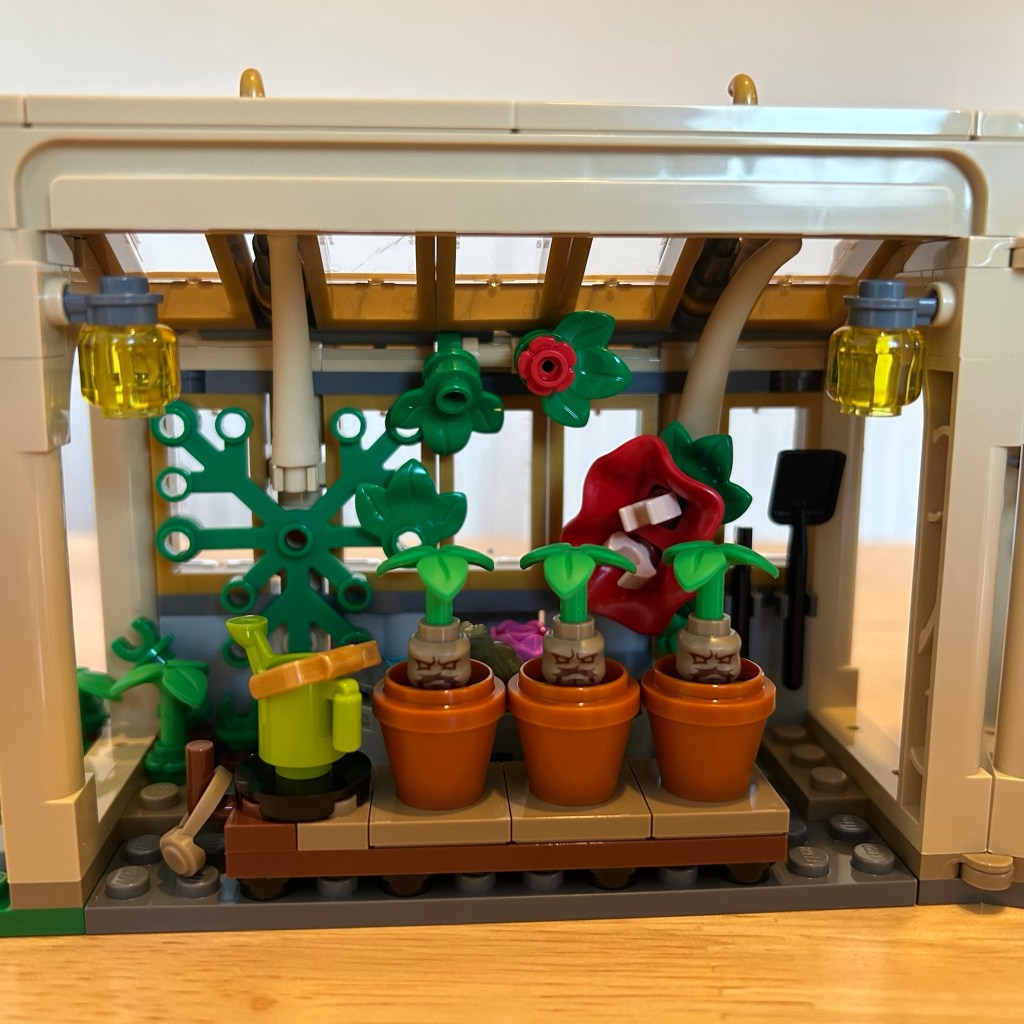 The build was pretty fun, seems like the Botanicals team had a helping hand in this set. All the little plant details are wonderful, the use of a skirt for a flower piece stands out to me in particular. The new moulds for the Mandrakes are nothing short of incredible, the plant pots that contain them are new to me, as I haven’t seen them before but they fit perfectly. I also noticed the reference to Neville’s Mimbulus Mimbletonia with the use of the new what I call potion explosion piece recoloured to sand green. This also can be displayed long ways or folded (I prefer the folded) and if you wanted to buy multiple sets, they could be placed back to back and these would look great next to a Hogwarts castle. I adore the over grown look but it takes up space in the already cramped area and its quite difficult to pace figures, the front sections do detach but I would prefer a little more space to place figures inside. Overall a lovely little set!