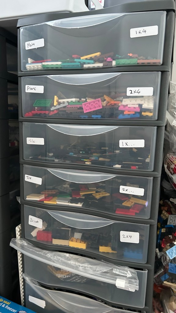 I now have bigger drawers, better storage, and more space to store things. I still have a lot of sorting to do but now it’s in localised bags of bricks, plates, tiles etc so once everything is sorted, it will be quicker and easier to store and upload to the shop, I already have just over 12,000 pieces in the shop but looking at what I have, I think I may be closer to 50,000 when it’s done, my goodness it’s a lot of pieces!