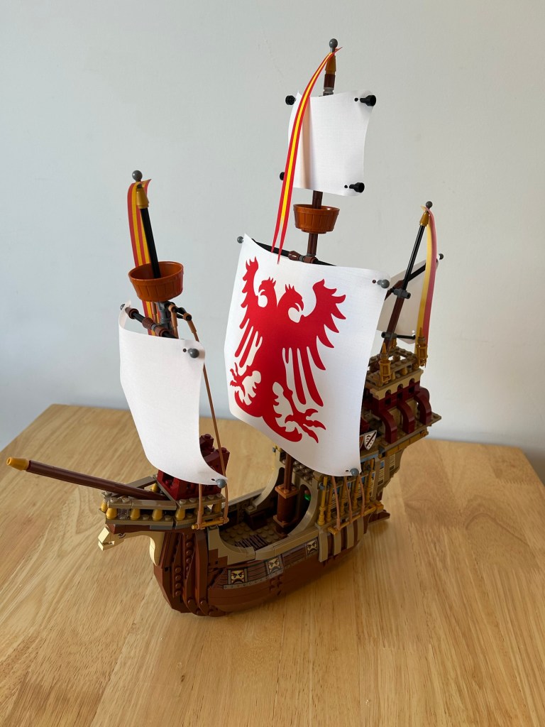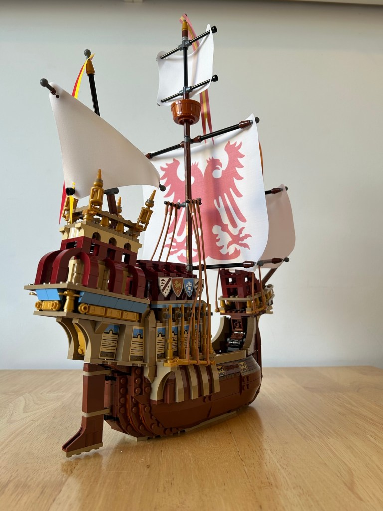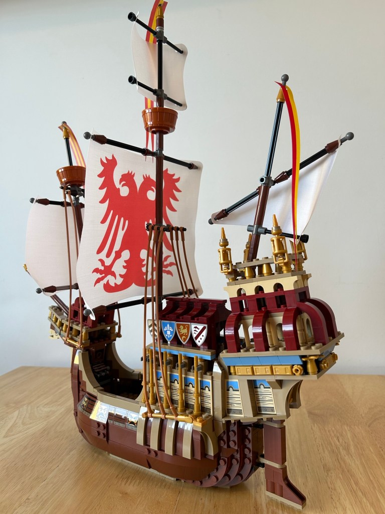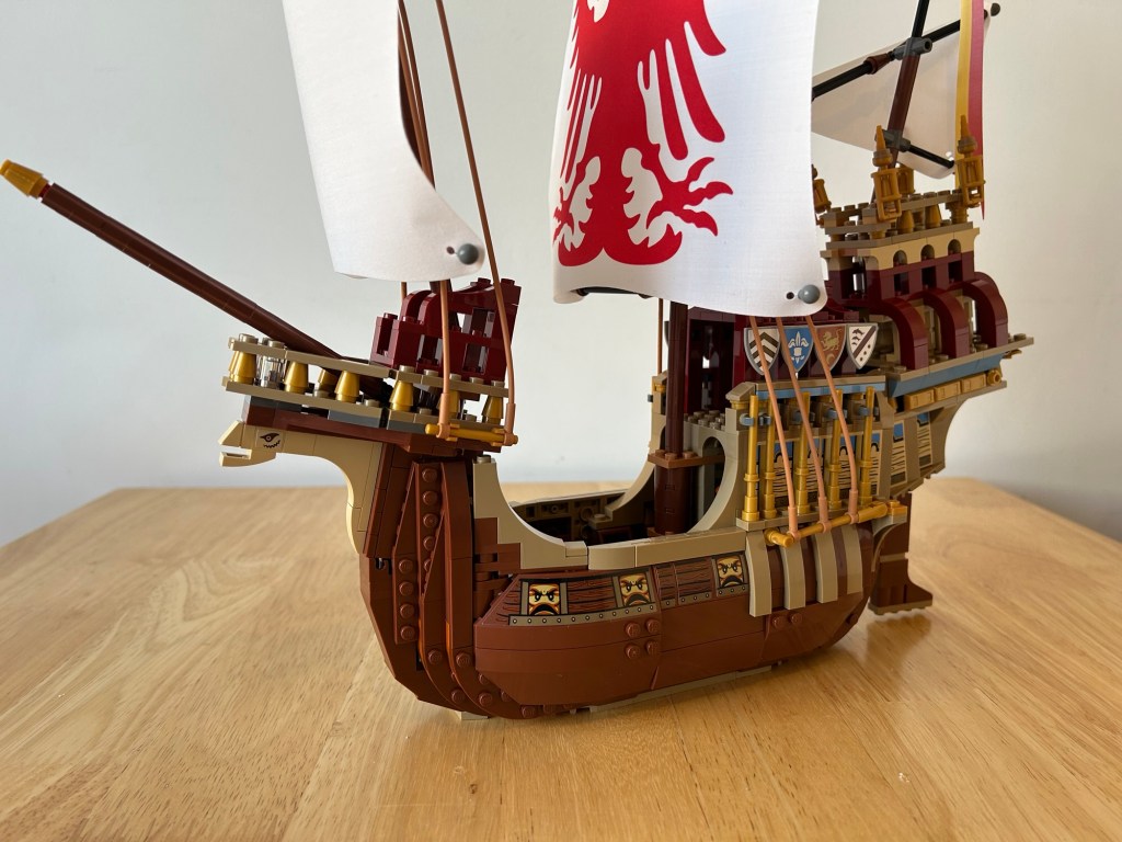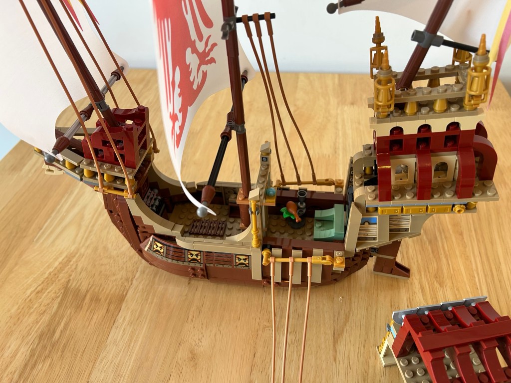 What an absolute beast of a ship! I never got the original one, which I am trying to track down for myself one day, so this is a very welcome addition to the collection, I love this, my favourite of the wave for last summer. All the prints you see are stickers, besides the sail,I honestly don’t mind stickers, it’s just an amazing set. The angles for the front and rear of the ship are created In a fun way and the ship even has an interior with some seating and a bed to take a nap, revealed by taking some rigging down and removing the centre section. The sails look great and the print for the centre one is chefs kiss. Before I bought this set I wasn’t sure on the price, which I paid full price for, but it was worth the money I feel.